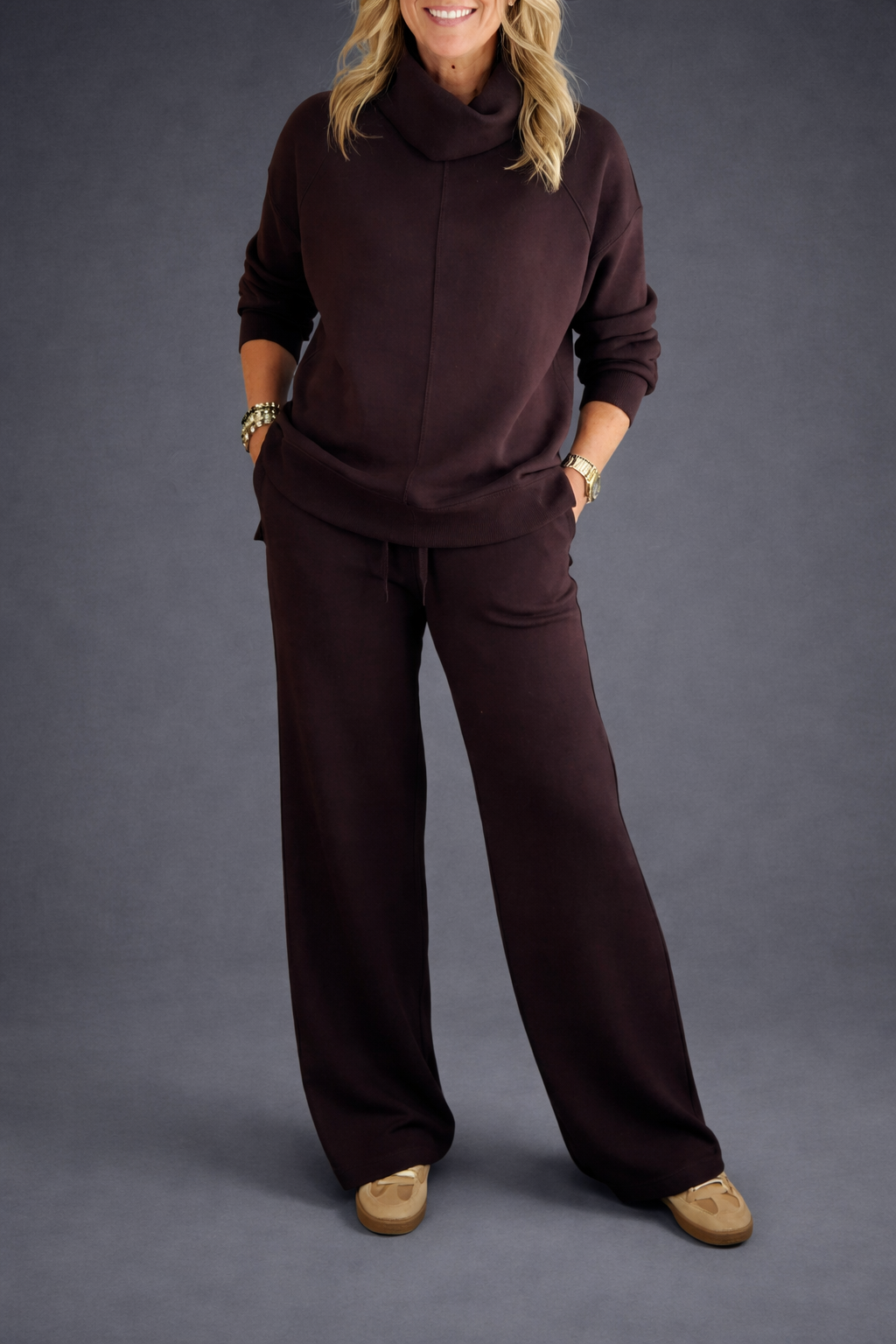 La coupe a été pensée pour tomber juste. Ni trop ample, ni trop ajustée, Léonie suit les lignes du corps avec fluidité, sans marquer ni comprimer. Le haut, avec son col montant délicatement enveloppant, apporte une chaleur douce et élégante, tandis que la fente discrète sur le côté offre une liberté de mouvement naturelle et une touche moderne. Le pantalon, doté d’une taille élastique confortable, reste bien en place et accompagne chaque geste, que l’on marche, que l’on s’assoie ou que l’on bouge tout au long de la journée.